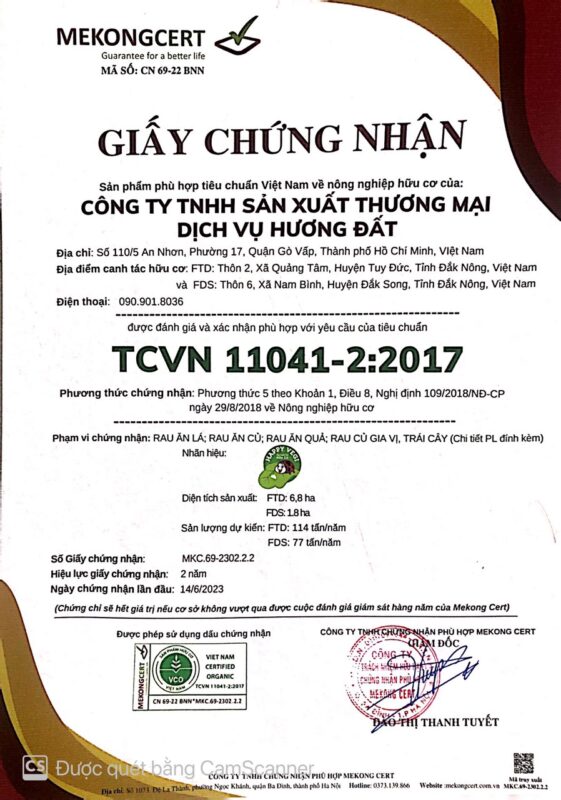 Chứng nhận sản phẩm được canh tác theo tiêu chuẩn hữu cơ của Việt Nam, liên tục được đánh giá và kiểm nghiệm an toàn và chất lượng cao dành cho người tiêu dùng